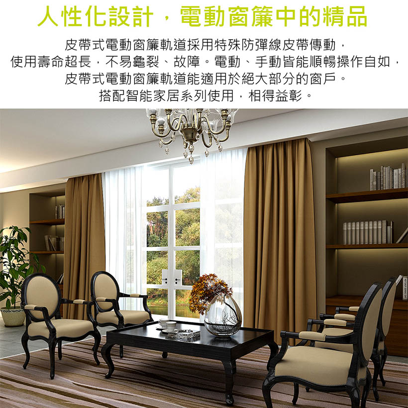 皮帶式電動窗簾軌道採用特殊防彈線皮帶傳動,使用壽命超長,不易龜裂、故障。電動、手動皆能順暢操作自如,皮帶式電動窗簾軌道能適用於絕大部分的窗戶。搭配智能家居系列使用,相得益彰。