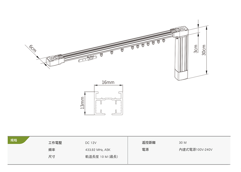 9.軌道最大長度:10米;最大承重:40kg;遙控距離達30M。頻率:433.92Mhz。