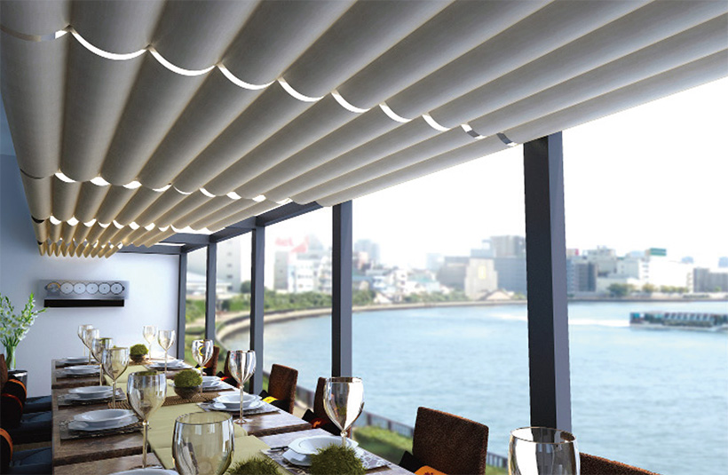 電動天窗簾,用運布簾的柔軟性及裝飾感,更顯空間挑高及設計感。常運用於景觀餐廳、戶外用餐空間、大型展示空間等高級居所。