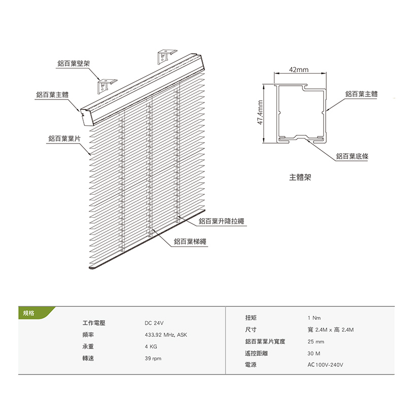 電動鋁百葉簾,簡潔、整理便捷且大方實用,適用於工業風格設計展現俐落有型。